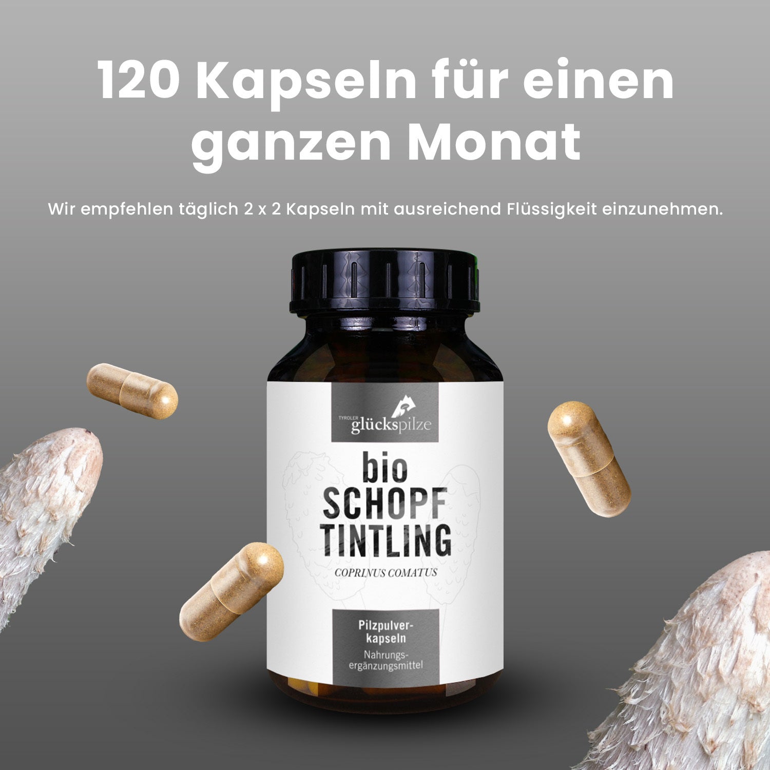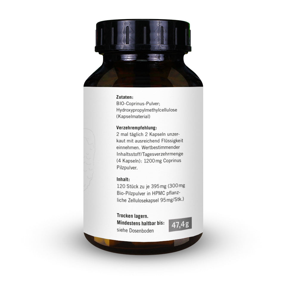 Inhalt: 120 Kapseln á 300 mg Coprinus-Pulver in nachhaltiger Glas-Verpackung