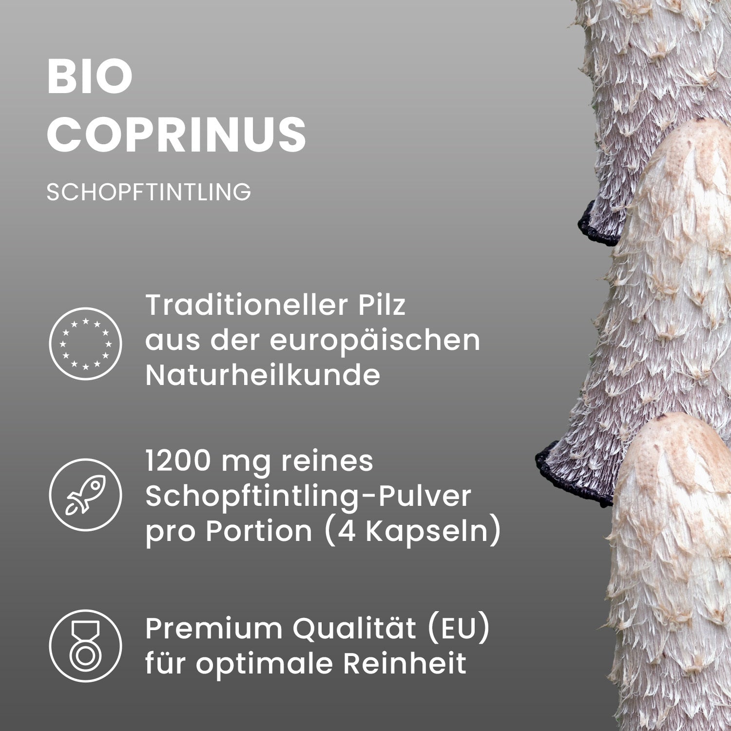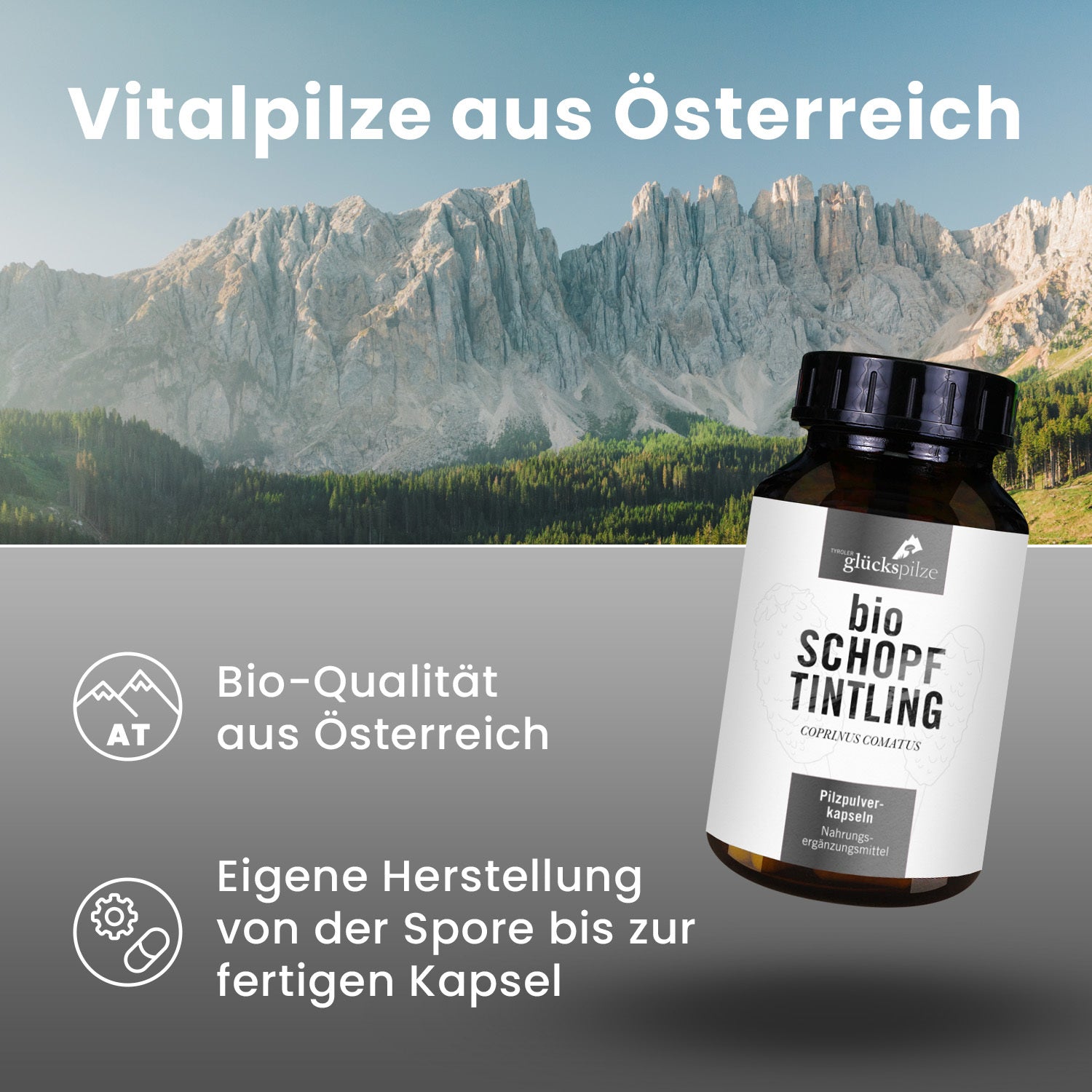 Unsere Kapseln beinhalten reines Coprinus-Pulver aus nachhaltigem Ursprung und ohne jegliche Zusatzstoffe. Es handelt sich um Pilzpulver vom ganzen Pilz. Der hochwertige Coprinus (Schopftintling) stammt aus regionaler Kultivierung in Österreich.