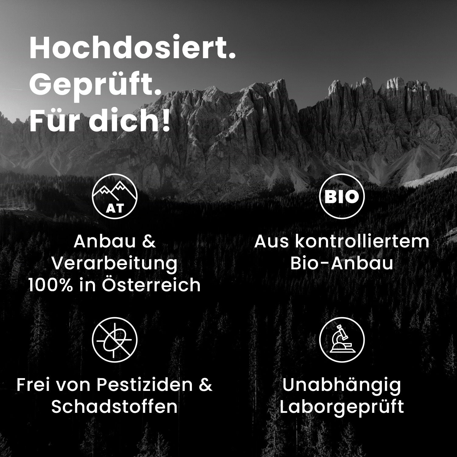 Nahrungsergänzungsmittel-Hinweis: Empfohlene tägliche Verzehrmenge nicht überschreiten. Kein Ersatz für eine ausgewogene und abwechslungsreiche Ernährung. Außerhalb der Reichweite von Kindern aufbewahren.
