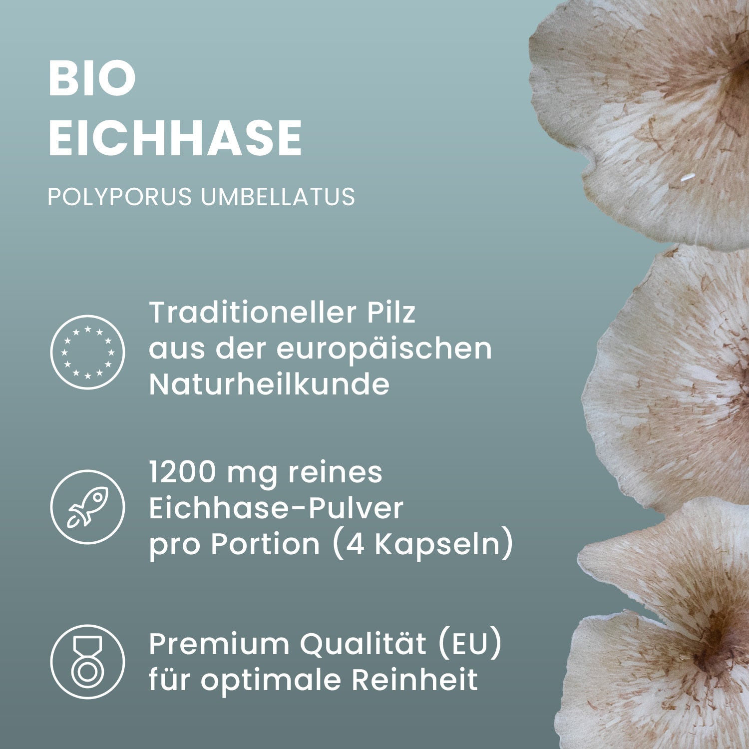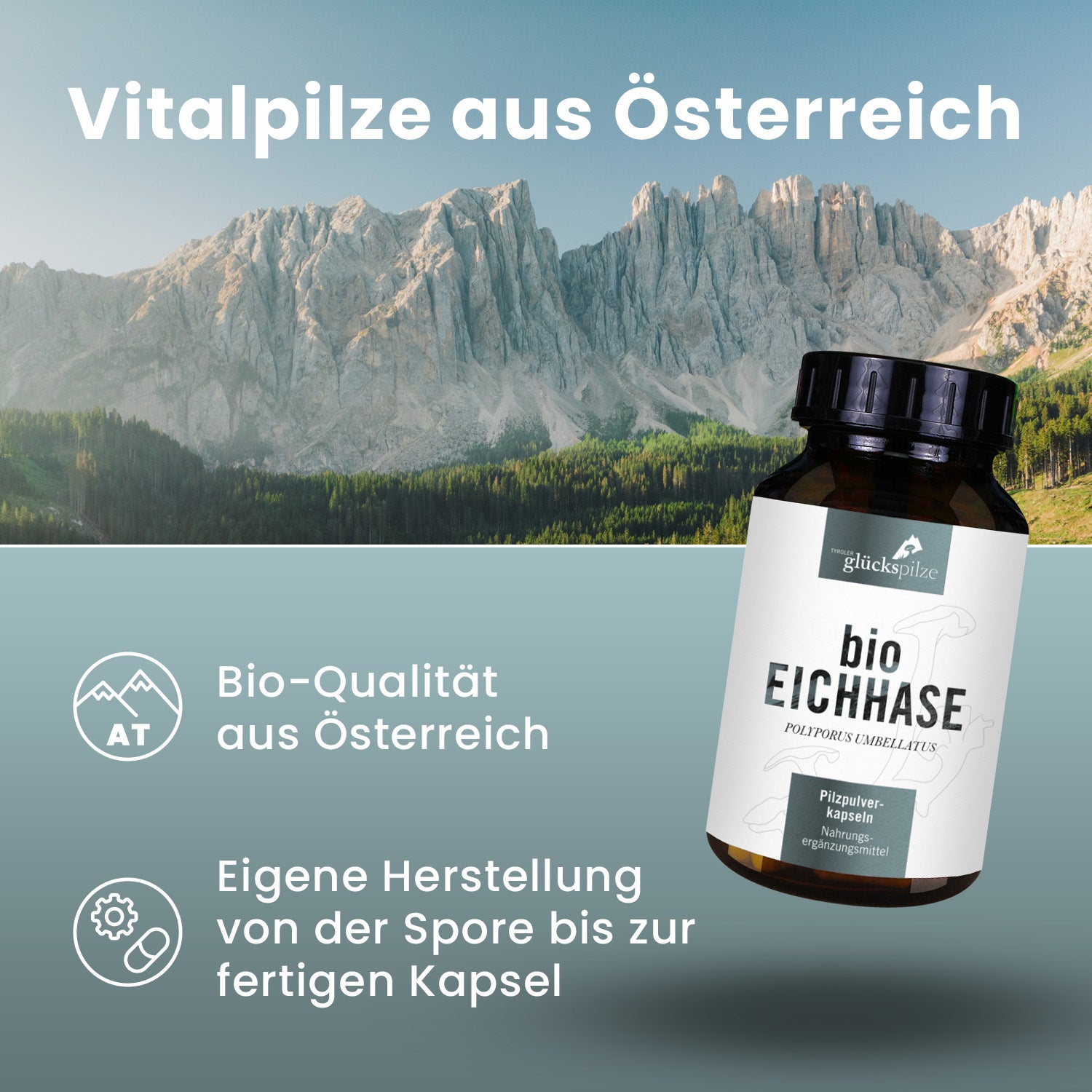 Unsere Kapseln beinhalten reines Eichhase-Pulver aus nachhaltigem Ursprung und ohne jegliche Zusatzstoffe. Es handelt sich um Pilzpulver vom ganzen Pilz. Der hochwertige Eichhase (Polyporus) stammt aus regionaler Kultivierung in Österreich.
