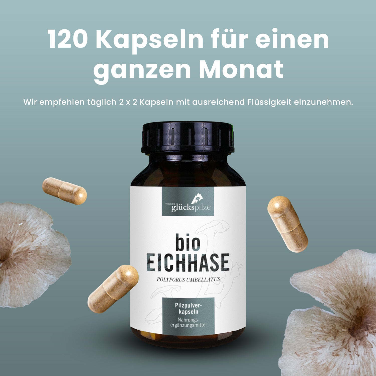 Inhalt: 120 Kapseln á 300 mg Eichhase-Pulver in nachhaltiger Glas-Verpackung